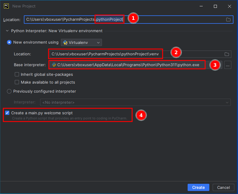 The only things you need to change are 1 and 4. Don’t touch 2 and 3! But for the moment, just accept the defaults to start our 1st python project. Click on the create button.
