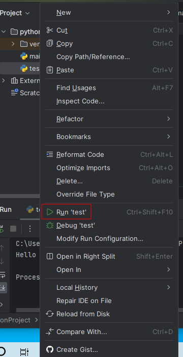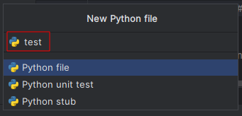 Now right click on PythonProject and add a new Python File. After clicking on the Python File give it a name test.
