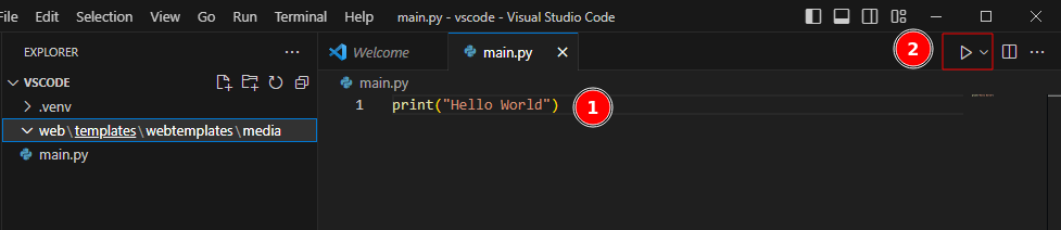 If you want to add files to a folder, just right click on the folder name and choose New File. In the editor write the code print(“Hello World”), hit ctrl+s to save the file and then push the button (2) to run your code. In the terminal you will see Hello World.