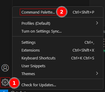 Now it’s time to activate our virtual environment. Click in the terminal window and type: .\.venv\Scripts\activate and hit Enter key. To type, start typing ./ven and wait a little bit and then powershell will adjust the path (will put the .\ in front), then hit the Tab key, it will auto complete to .\.venv\ then hit the S key and then hit back the Tab key, it will complete now to .\.venv\Scripts\ and now hit the a key and then hit the Tab key again and it will auto complete the command, now hit the Enter key to execute the command. Your prompt in the terminal will change now to something like that: (.venv) PS C:\Users\vboxuser\PycharmProjects\vscode> As you see, you now have the (.venv) at the beginning of the prompt that let’s you know that you are inside a virtual environment. Now we need to tell vscode that he needs that virtual environment to run the python code. Click on the icon(1) and choose the option Command Palette.