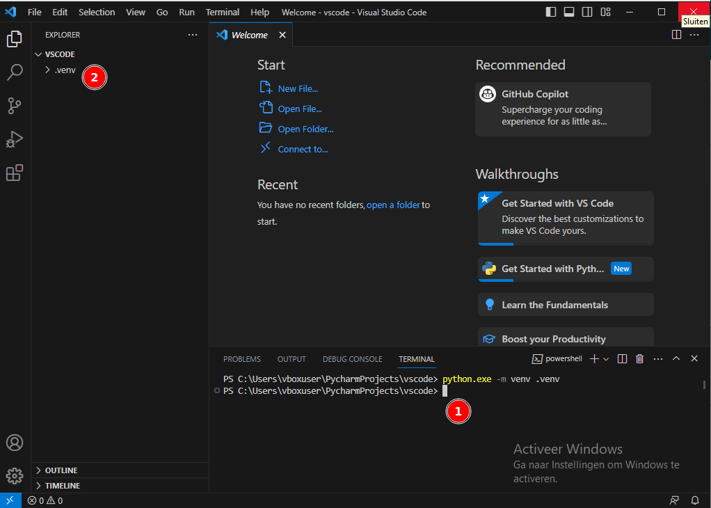Where you see the 1, that’s your command prompt in vscode. Now we need to make a virtual environment for our python code. Click in the terminal window and type: python.exe -m venv .venv and press enter. The second venv has a dot at the beginning! After the command finished, you get your prompt back (1) and you see that you have now a new folder in you vscode folder named .venv. (2)