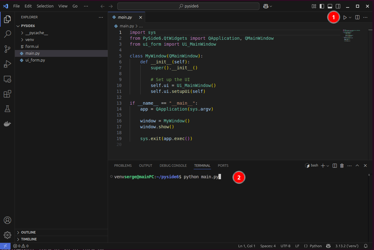To achieve that we use the command: pyside6-uic form.ui -o ui_form.py