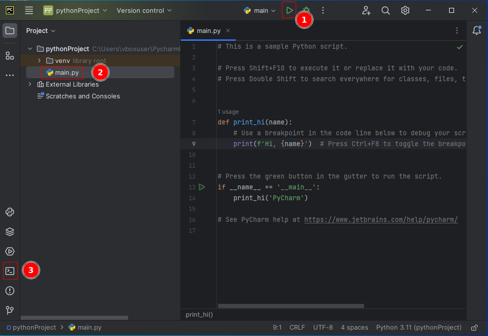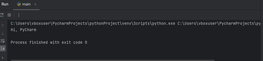 As you see, the code executed without errors and greets with Hi, PyCharm.