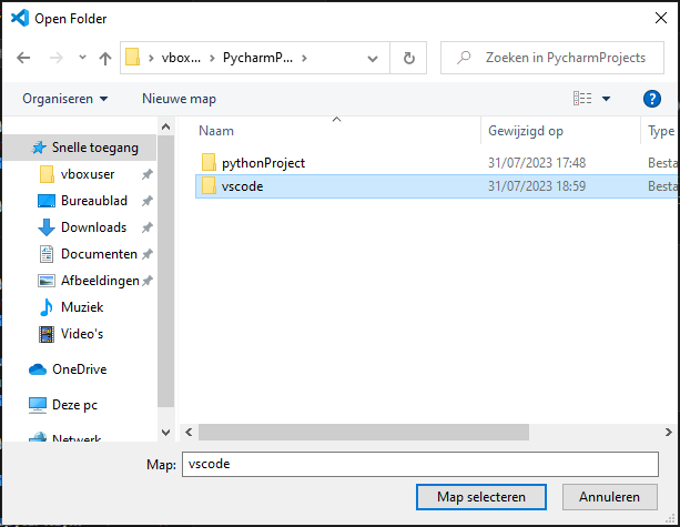 Double click that folder and in the new window, make a new folder with the name vscode and choose to select that folder.